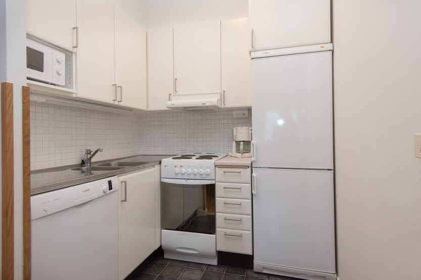 Køkkenet indeholder: elkomfur med ovn, køleskab, frys, microovn, opvaskemaskine.
