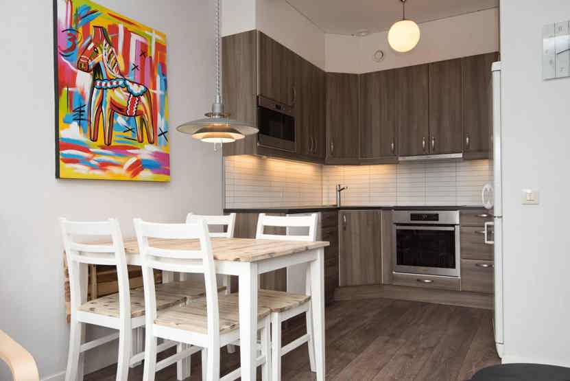 Køkkenet indeholder: elkomfur med ovn, køleskab, frys, microovn, opvaskemaskine.