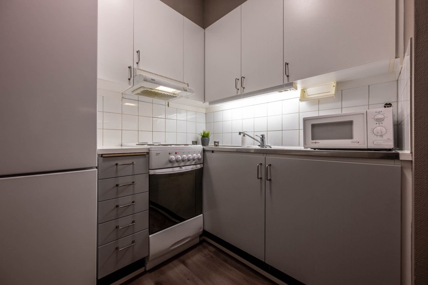 Køkkenet indeholder: elkomfur med ovn, køleskab, frys, microovn.