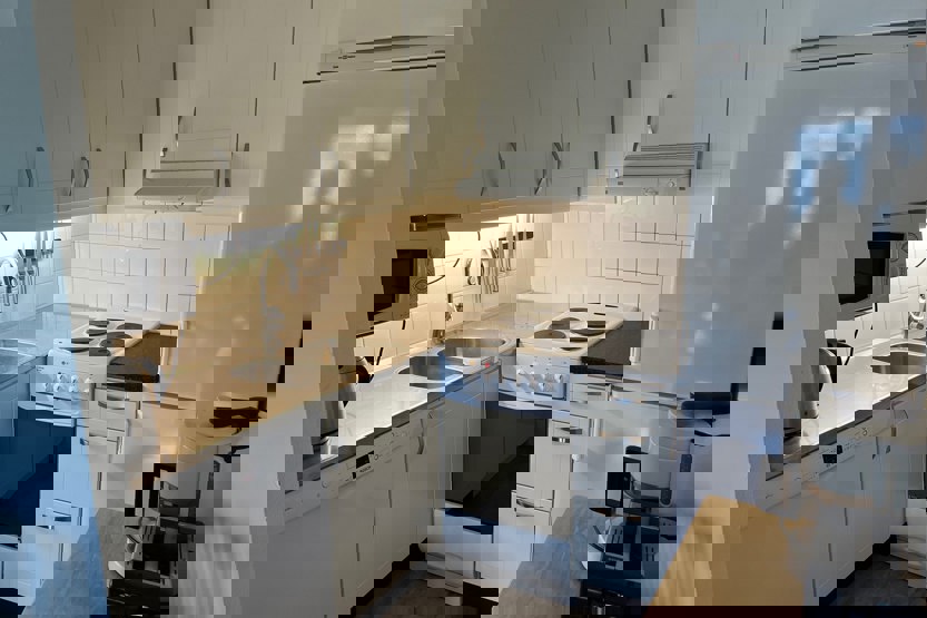 Køkkenet indeholder: elkomfur med ovn, køleskab, frys, opvaskemaskine, microovn.