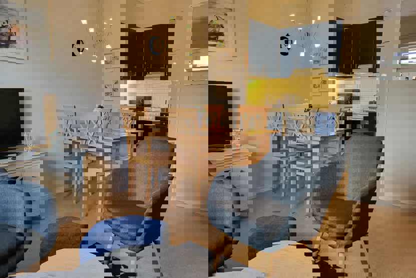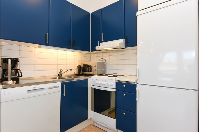 Køkkenet indeholder: elkomfur med ovn, køleskab, frys, opvaskemaskine, microovn.