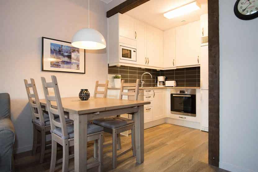 Køkkenet indeholder: elkomfur med ovn, køleskab, frys, opvaskemaskine, microovn.