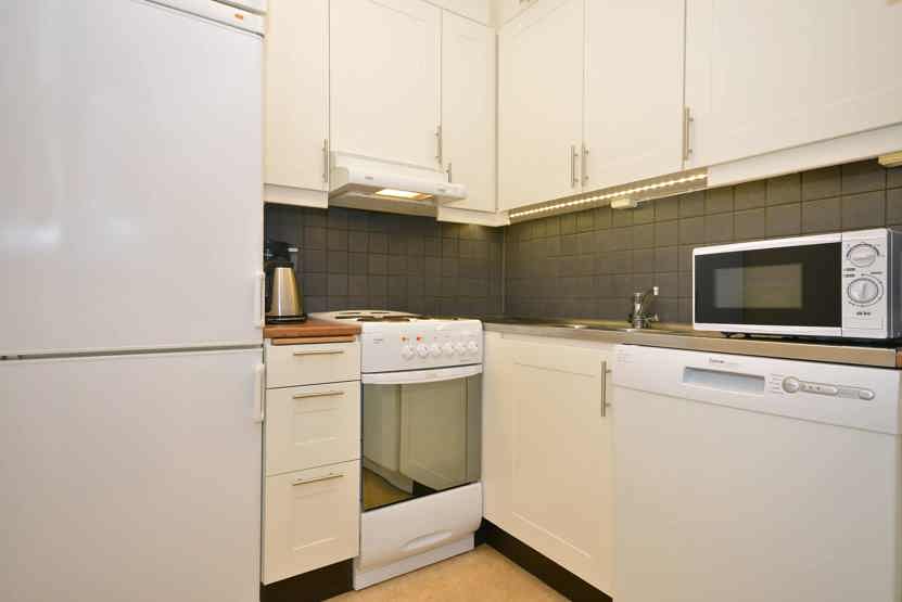 Køkkenet indeholder: elkomfur med ovn, køleskab, frys, opvaskemaskine, microovn.