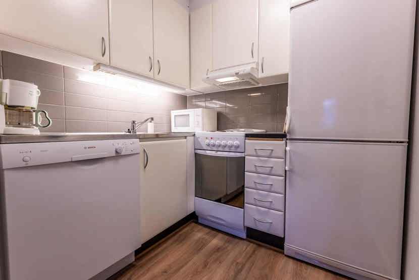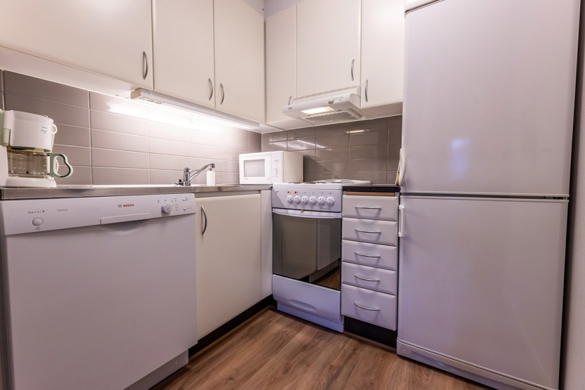 Køkkenet indeholder: elkomfur med ovn, køleskab, frys, opvaskemaskine, microovn.