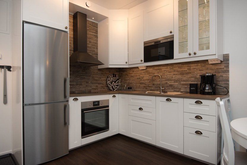 Køkkenet indeholder: elkomfur med ovn, køleskab, frys, microovn, opvaskemaskine.