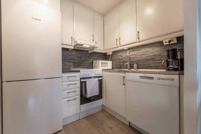 Køkkenet indeholder: elkomfur med ovn, køleskab, frys, opvaskemaskine, microovn.