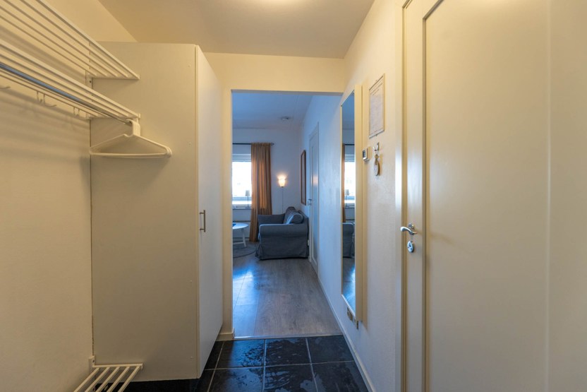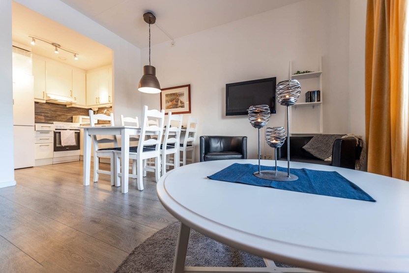 Opholdsstue med køkkenafdeling. TV, tørreskab, rum til skiudstyr, balkon, Adgang til sauna og vaskerum, elevator findes i huset.