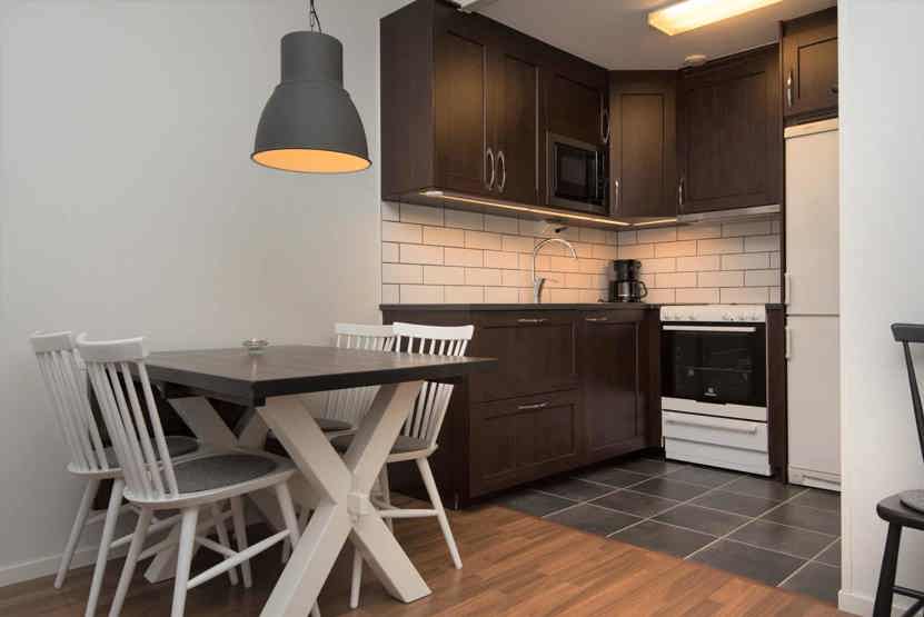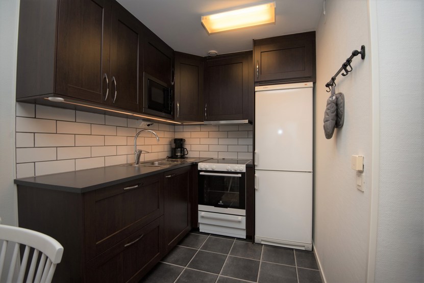 Køkkenet indeholder: elkomfur med ovn, køleskab, frys, microovn.