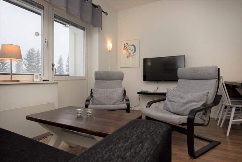 TV, tørreskab, rum til skiudstyr, balkon, Adgang til sauna og vaskerum, elevator findes i huset.