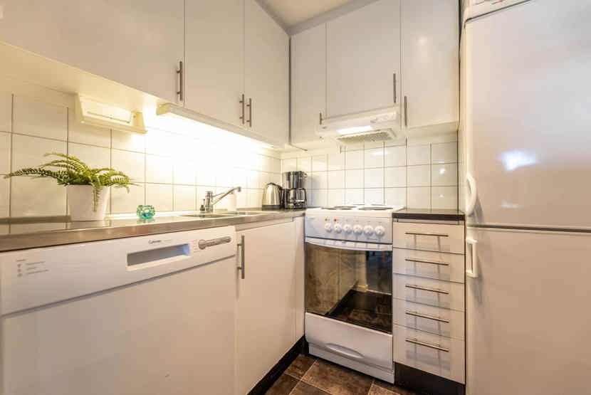 Køkkenet indeholder: elkomfur med ovn, køleskab, frys, opvaskemaskine, microovn.