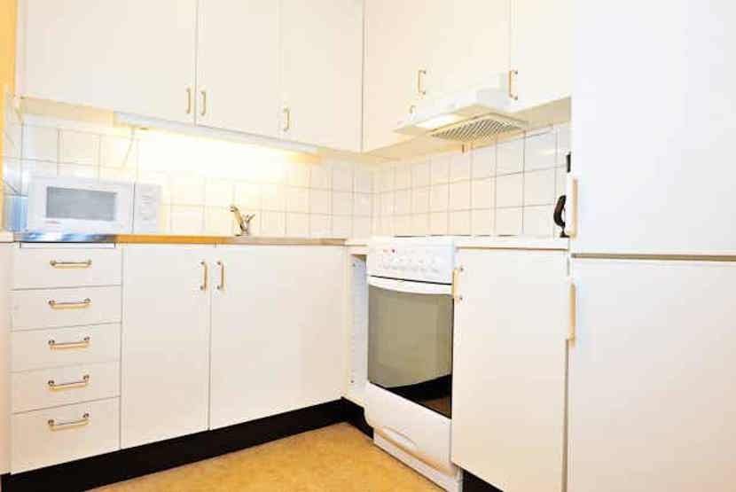 Køkkenet indeholder: elkomfur med ovn, køleskab, frys, opvaskemaskine, microovn.