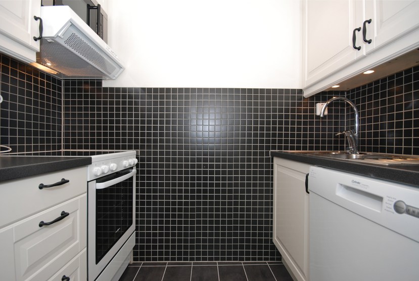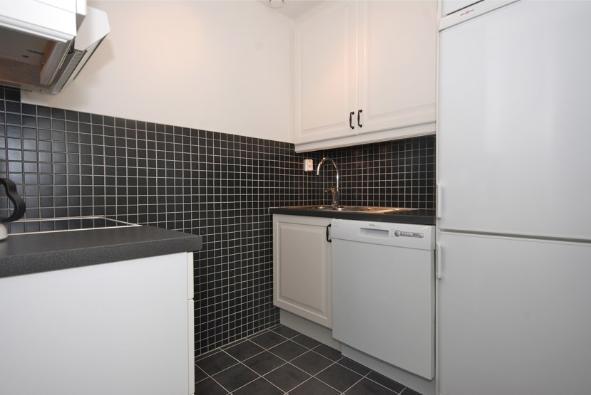 Køkkenet indeholder: elkomfur med ovn, køleskab, frys, opvaskemaskine, microovn.