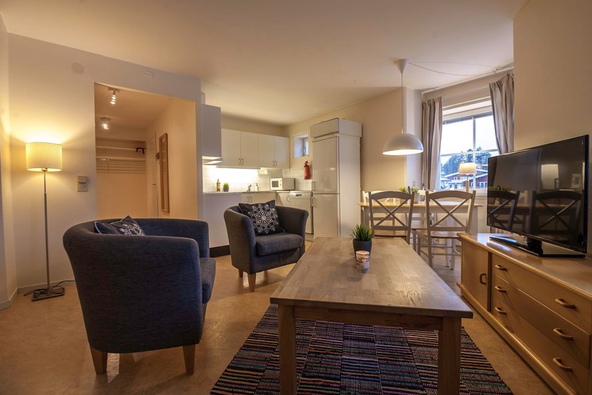 Opholdsstue med køkkenafdeling. TV, tørreskab, rum til skiudstyr, Adgang til sauna og vaskerum, ingen balkon, elevator findes i huset.