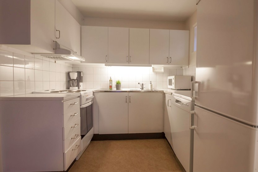 Køkkenet indeholder: elkomfur med ovn, køleskab, frys, opvaskemaskine, microovn.