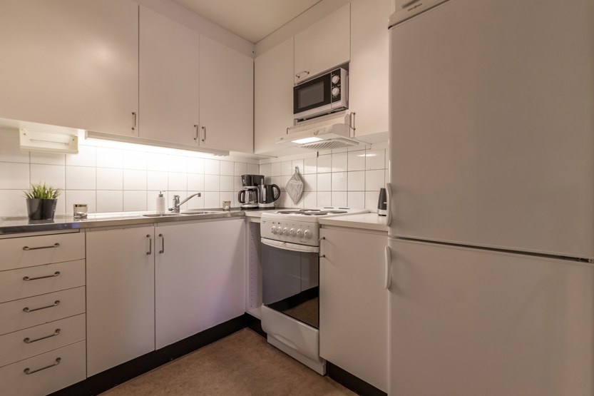 Køkkenet indeholder: elkomfur med ovn, køleskab, frys, microovn.