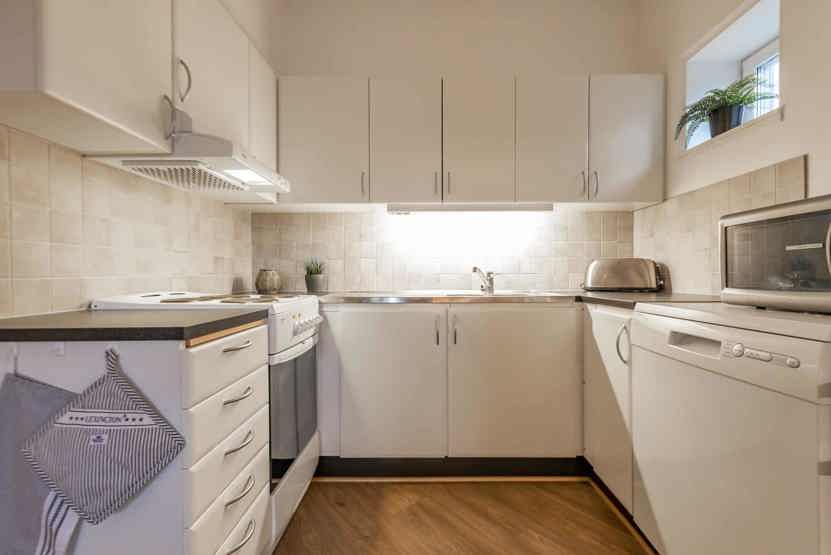 Køkkenet indeholder: elkomfur med ovn, køleskab, frys, opvaskemaskine, microovn.