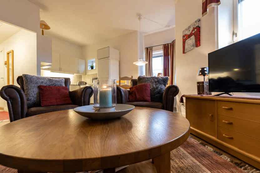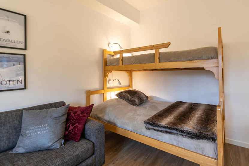Opholdsstue med kombineret køkken/opholdsstue/soveværelse, sovesofa til 2 personer, 1 køjeseng med 120 cm bred underkøje .