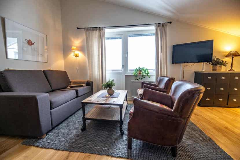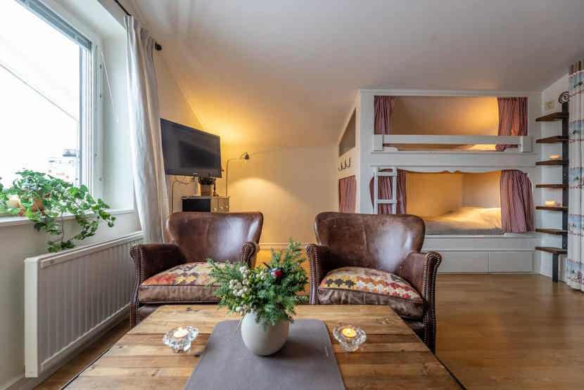 Opholdsstue med kombineret køkken/opholdsstue/soveværelse, sovesofa til 1 person, 1 køjeseng med 120 cm bred underkøje .