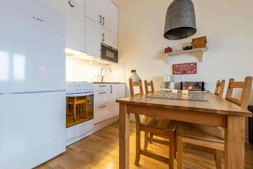 Køkkenet indeholder: elkomfur med ovn, køleskab, frys, microovn.