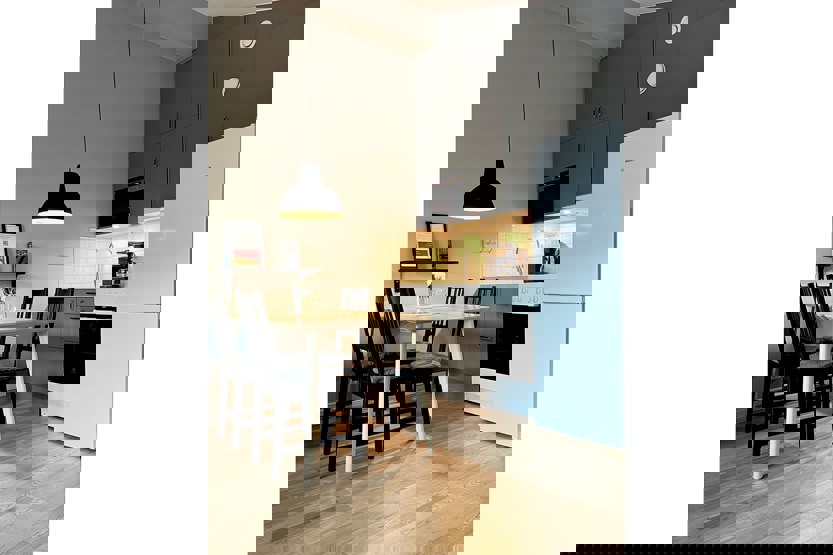 Køkkenet indeholder: elkomfur med ovn, køleskab, frys, microovn.