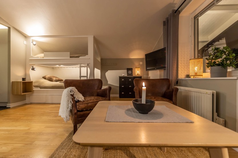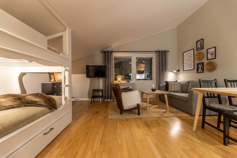 Opholdsstue med kombineret køkken/opholdsstue/soveværelse, sovesofa til 1 person, 1 køjeseng med 120 cm bred underkøje .