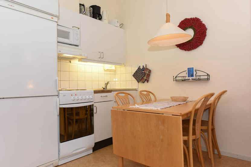 Køkkenet indeholder: elkomfur med ovn, køleskab, frys, microovn.