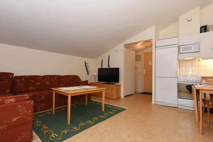 Opholdsstue med kombineret køkken/opholdsstue/soveværelse, sovesofa til 2 personer, 1 køjeseng.