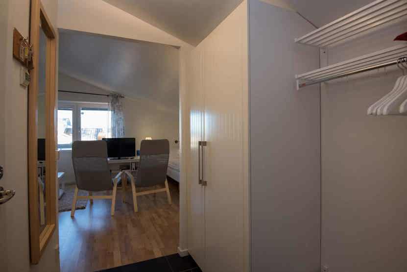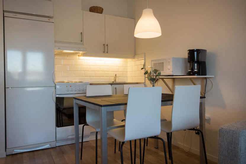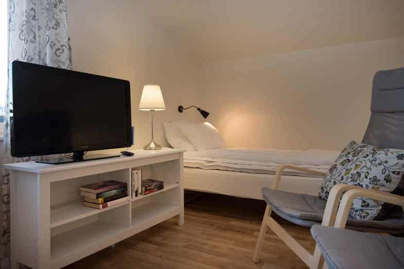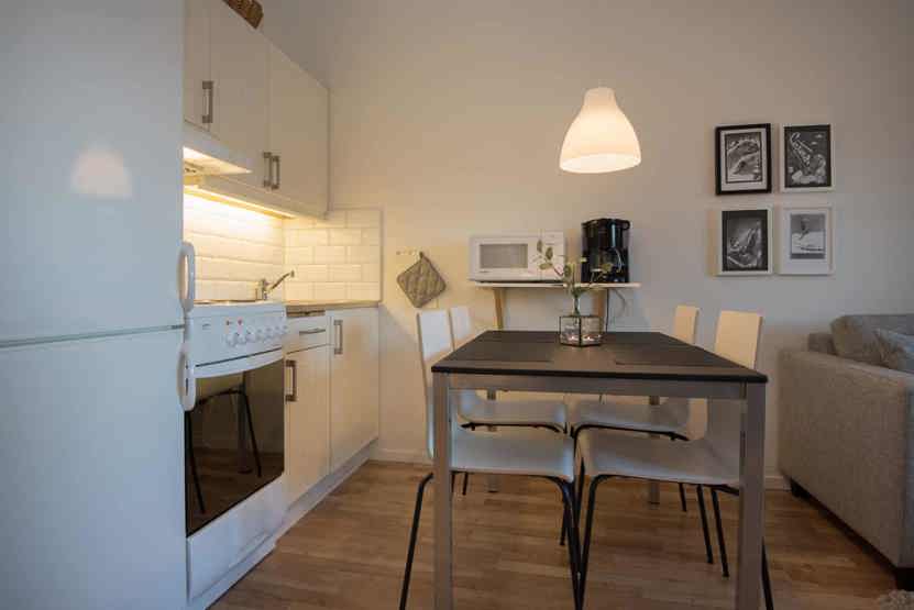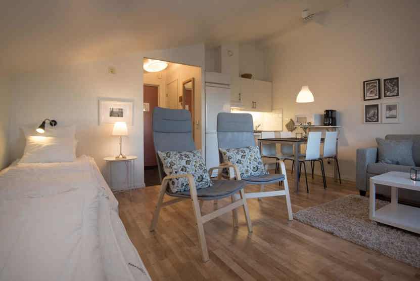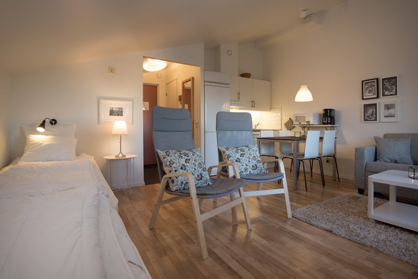 Opholdsstue med kombineret køkken/opholdsstue/soveværelse, 1 sovesofa 140 cm bred, 2 enkeltsenge.