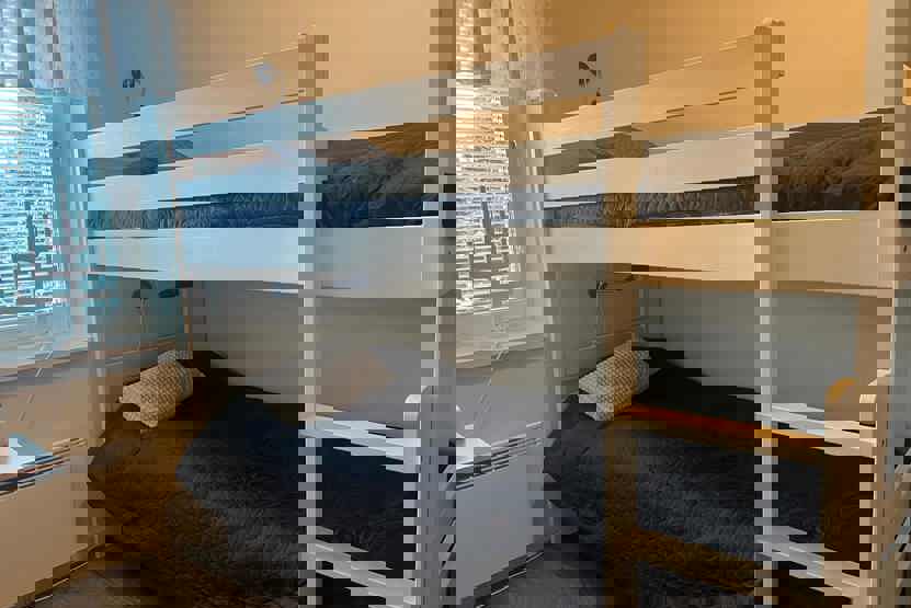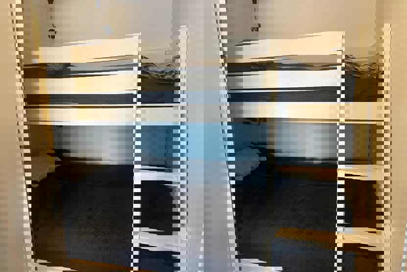 Soveværelse-1= 1 køjeseng hvor både over og underkøje er 90 cm bred, 1 køjeseng med 120 cm bred underkøje .