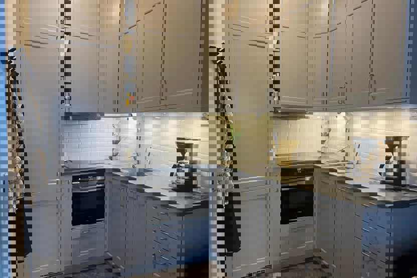 Køkkenet indeholder: elkomfur med ovn, køleskab, frys, opvaskemaskine, microovn.
