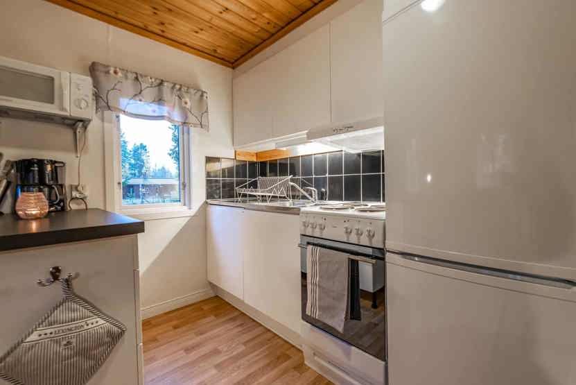 Køkkenet indeholder: elkomfur med ovn, køleskab, frys, microovn.