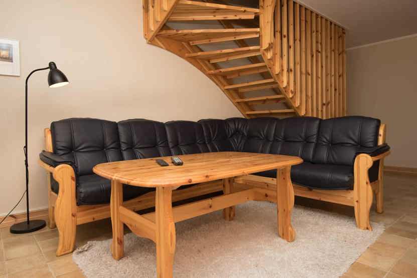 Opholdsstue med køkkenafdeling øvre etage, og opholdsstue på nedre etage.