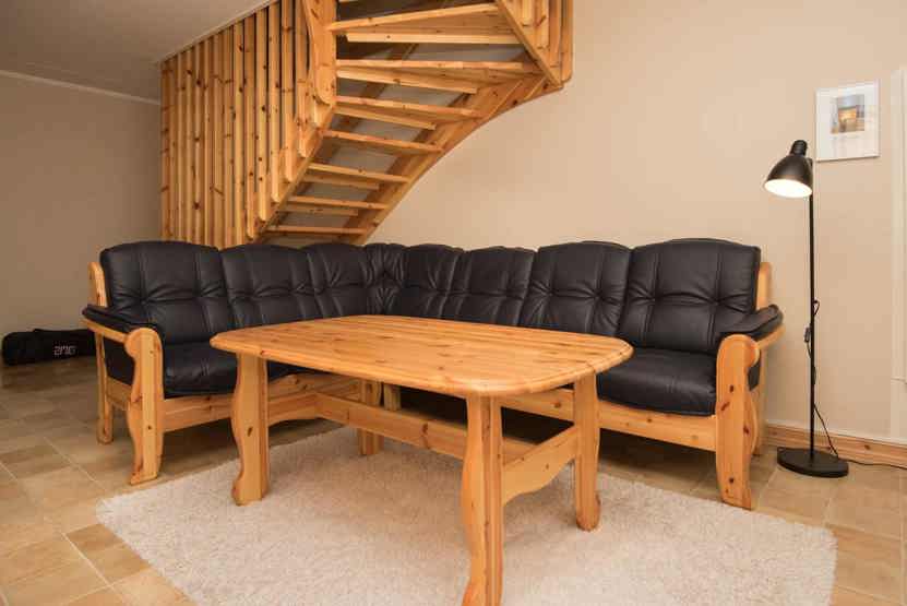 Opholdsstue med køkkenafdeling øvre etage, og opholdsstue på nedre etage.