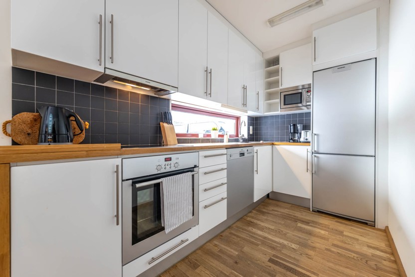 Køkkenet indeholder: elkomfur med ovn, køleskab, frys, opvaskemaskine, microovn.