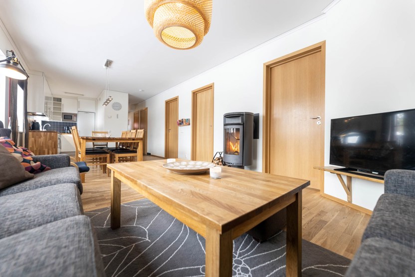 TV, brændeovn (brænde indgår ikke), tørreskab, vaskemaskine, tørretumbler, 1 højstol, 1 barneseng, rum til skiudstyr, altan (skovles ikke), adgang til elbilopladere med type 2 stik mod betaling.