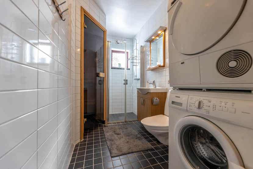 Badeværelset-1 = bruse/wc/sauna. Badeværelset-2 = wc.
