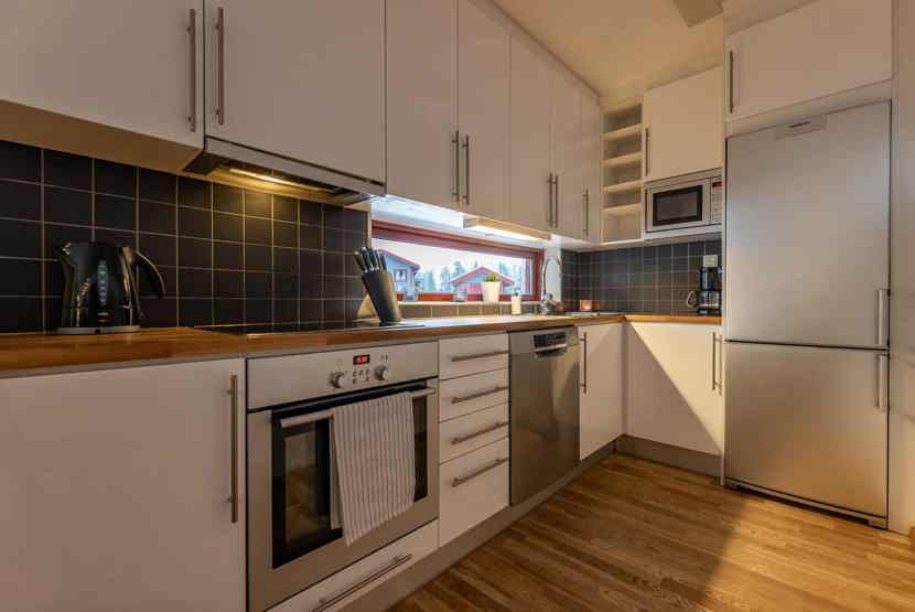 Køkkenet indeholder: elkomfur med ovn, køleskab, frys, opvaskemaskine, microovn.