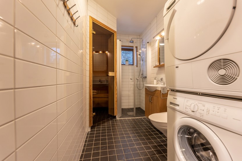 Badeværelset-1 = bruse/wc/sauna. Badeværelset-2 = wc.