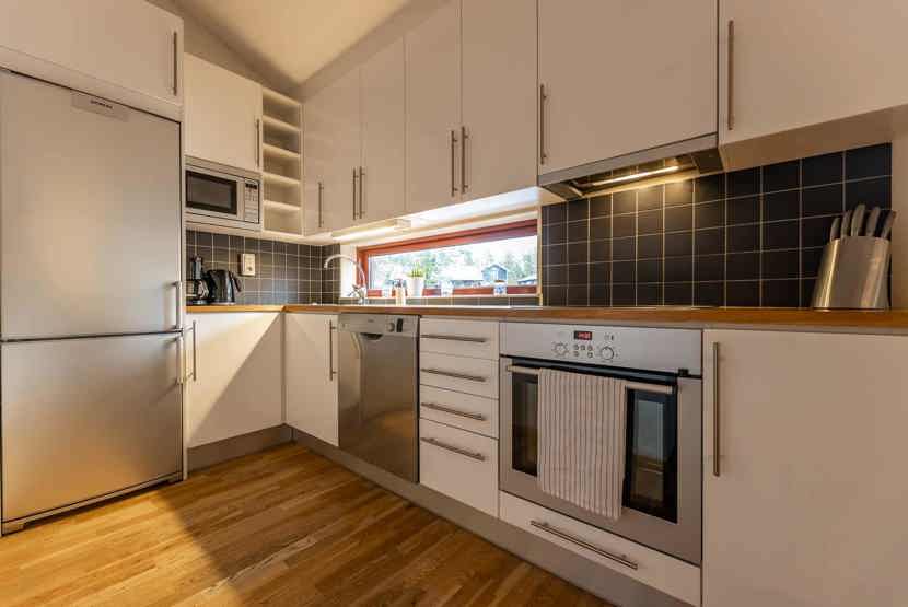 Køkkenet indeholder: elkomfur med ovn, køleskab, frys, opvaskemaskine, microovn.