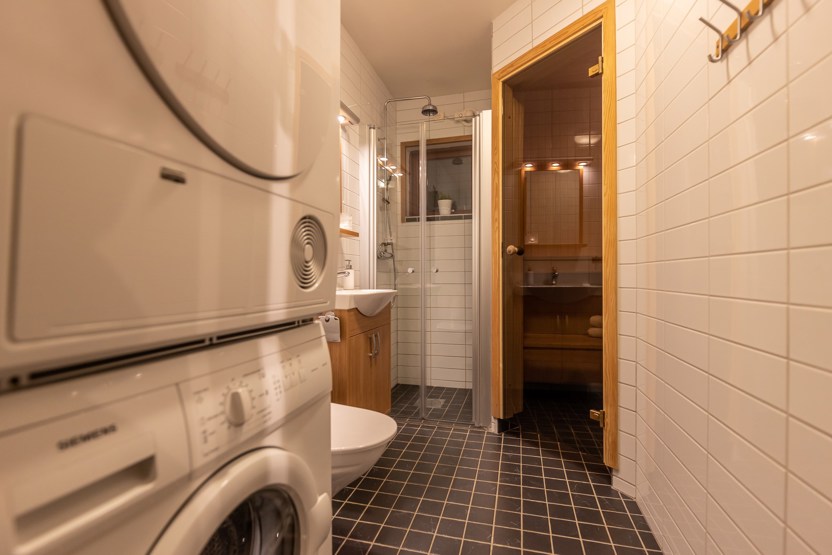 Badeværelset-1 = bruse/wc/sauna. Badeværelset-2 = wc.