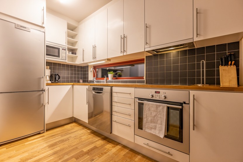 Køkkenet indeholder: elkomfur med ovn, køleskab, frys, opvaskemaskine, microovn.