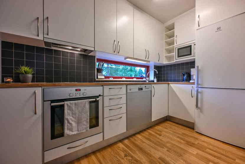 Køkkenet indeholder: elkomfur med ovn, køleskab, frys, opvaskemaskine, microovn.