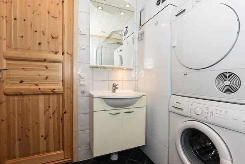 vaskemaskine, tørretumbler, skistøvletører, altan (skovles ikke), udtag til motorvarmer til bilen forefindes. Kræver specielt stik i bilen, rum til skiudstyr.