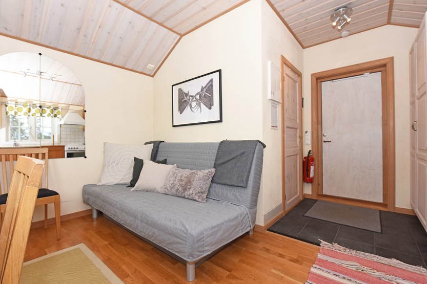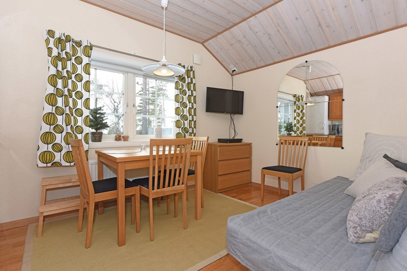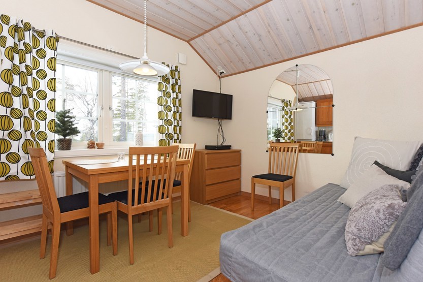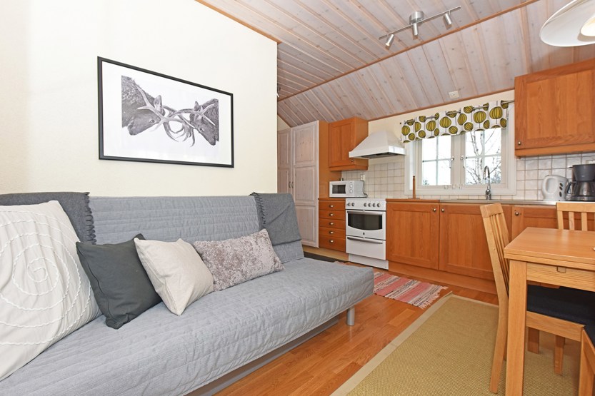 Opholdsstue med kombineret køkken/opholdsstue/soveværelse.