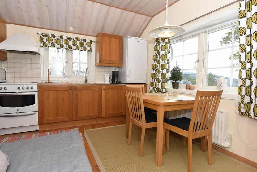 Køkkenet indeholder: elkomfur med ovn, køleskab, frostboks, microovn.