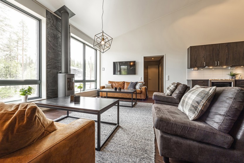 Opholdsstue med køkkenafdeling. TV, brændeovn (brænde indgår ikke), vaskemaskine, tørreskab, rum til skiudstyr.