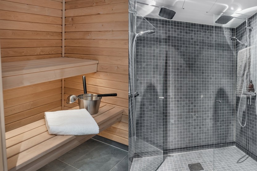 Badeværelset-1 = dobbelt brusebad, wc, sauna. Badeværelset-2 = wc.