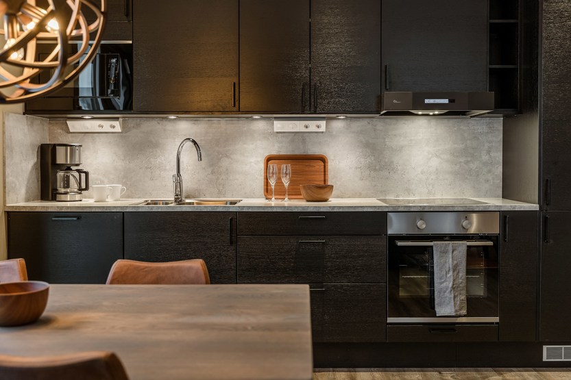 Køkkenet indeholder: kogeplade, ovn, køleskab, frys, microovn, opvaskemaskine.