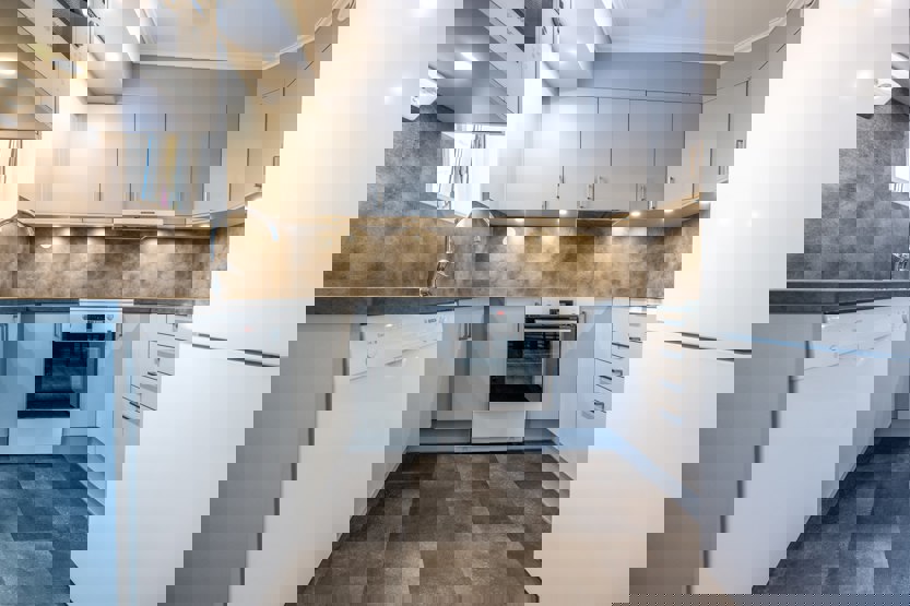 Køkkenet indeholder: elkomfur med ovn, køleskab, frys, opvaskemaskine, microovn.