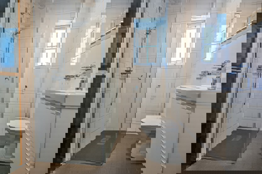 Badeværelset-1 = bruse/wc/sauna. Badeværelset-2 = bruse/wc.
